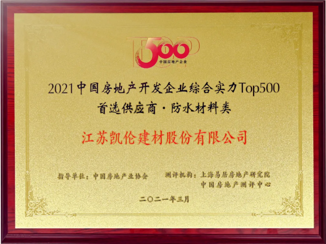 此次论坛上,《2021中国房地产开发企业综合实力TOP500测评研究报告》和《2021中国房地产开发企业综合实力TOP500首选供应商服务商品牌测评研究报告》同时揭晓。江苏凯伦建材股份有限公司再次入选中国房地产开发企业500强首选供应商服务商品牌测评榜单(防水材料类),品牌首选率位列前三,TOP100房企战略合作落地率位列前三,TOP50开发商评优企业同样位居前三甲。